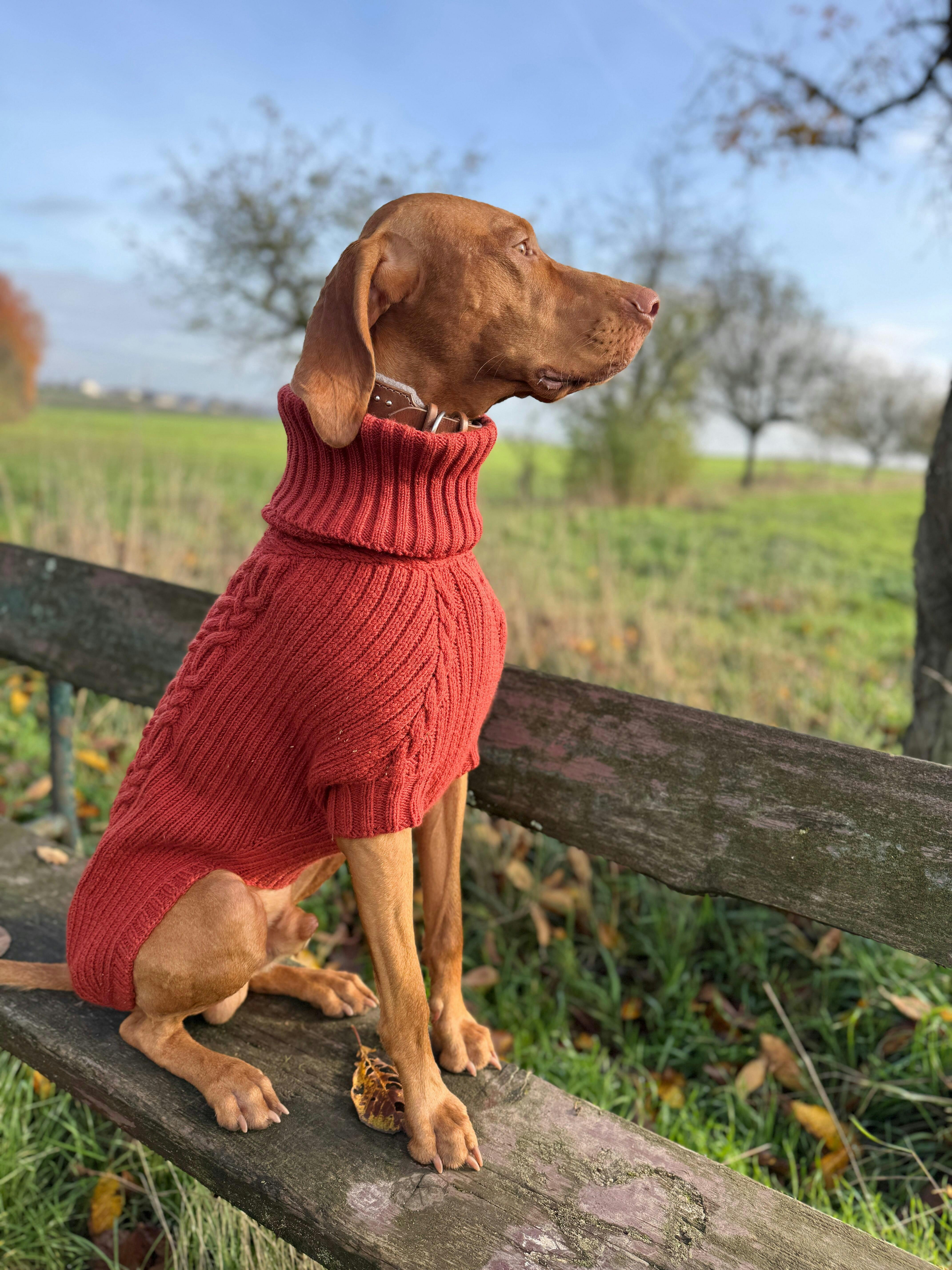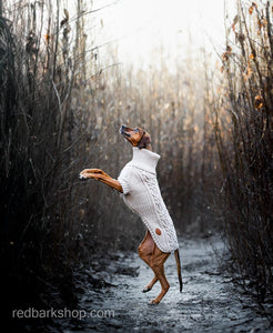 The sweater is made for Vizslas but also fits German Shorthaired pointers, works as a Weimaraner sweater, English or Danish pointer sweater, Dalmatian sweater, The cable knitted jumper also fits Airedale Terriers and English Springer Spaniels as well as Brittany Spaniels and many others!