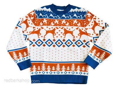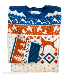 Charming navy, burnt orange and cream knitted merino wool blend sweater featuring a fair isle forest landscape with mountains and upland birds with a spotlight on pointing dogs. Designed after my own dogs, and named after a local mountain range in Squamish, BC. Created with a thick extra-warm heavyweight chunky knit, ready to snuggle in the cold season. Very limited numbers made, so please contact if your size is not available.